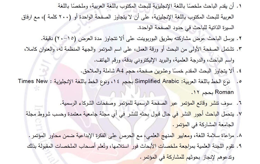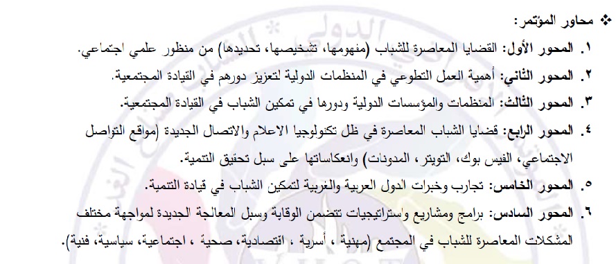 ونحث جميع الباحثين على المشاركة في فعاليات المؤتمر بأوراق عمل أو أوراق بحثيو ضمن محاور المؤتمرالتالية :